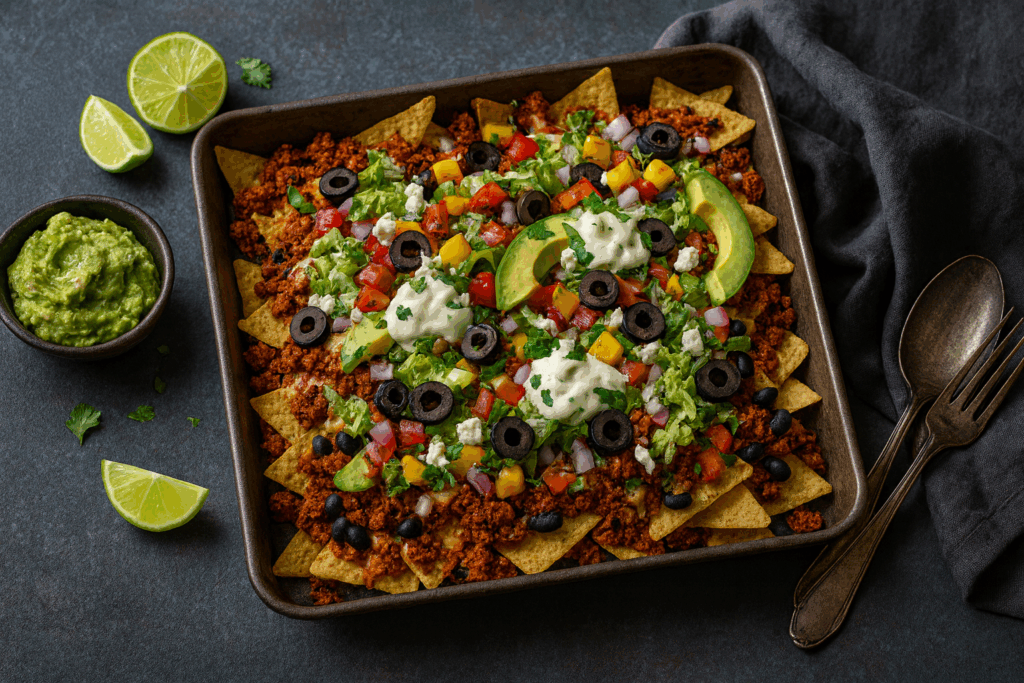 These nachos are all about layers, crunchy tortilla chips, savoury spiced tofu, melty cheese, and a mountain of fresh toppings. The tofu is grated and pan-fried until golden and crisp, then seasoned with a bold, smoky spice blend for maximum flavour. Customise with your favourite toppings: guacamole, salsa, black beans, hot sauce… it’s all welcome.